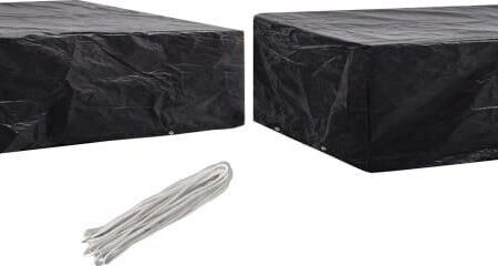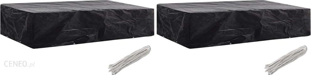Kolor: czarny Materiał: pokrowiec z PE (polietylenu) + aluminiowe oczka Wymiary: 218 x 77 x 55 cm (dł. x szer. x wys.)Gramatura tkaniny: 90 g/m²Z 8 oczkamiWodoszczelny, wytrzymały i odporny na promieniowanie UVW komplecie linka mocującaPrzesyłka obejmuje 2 pokrowce na meble ogrodowe